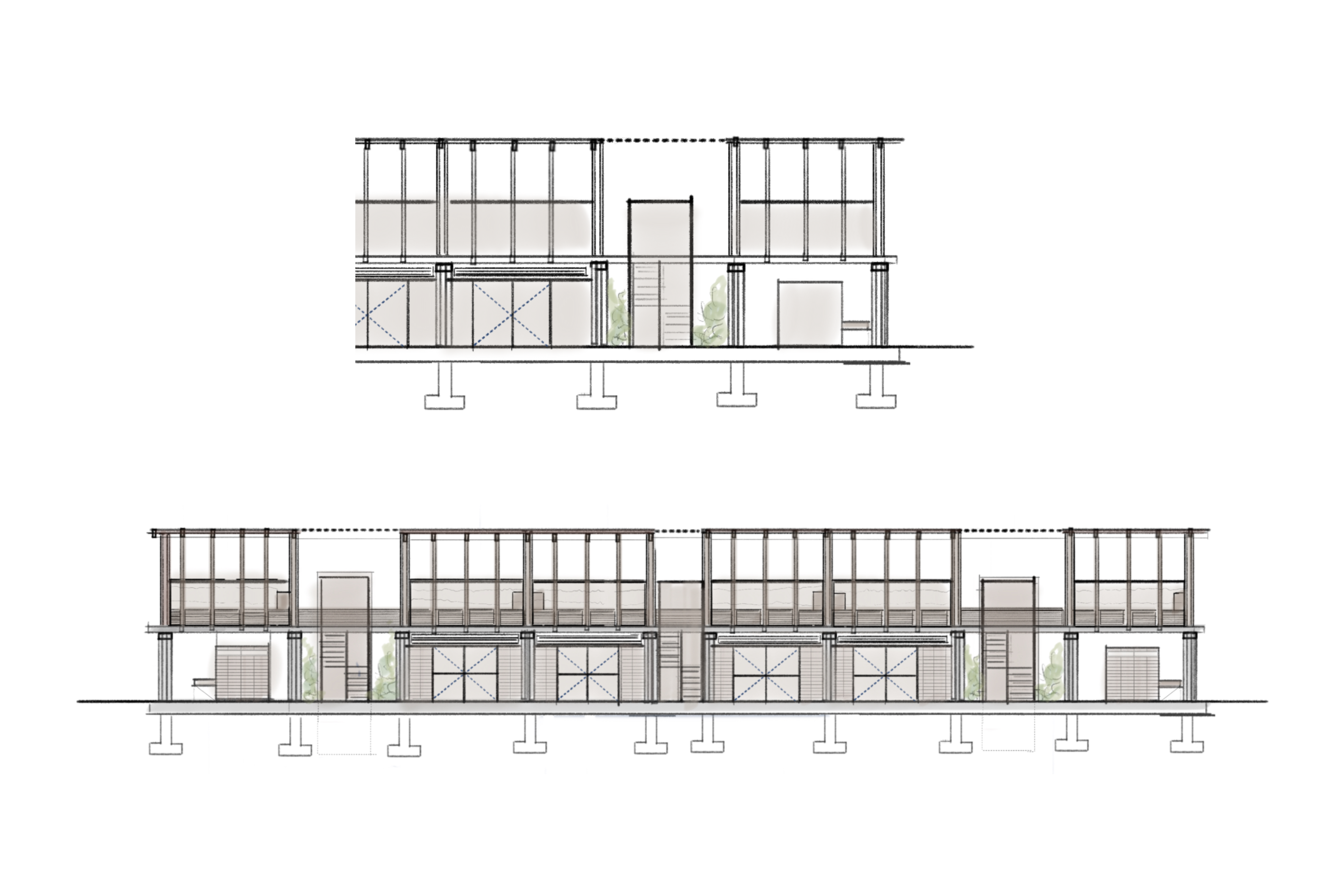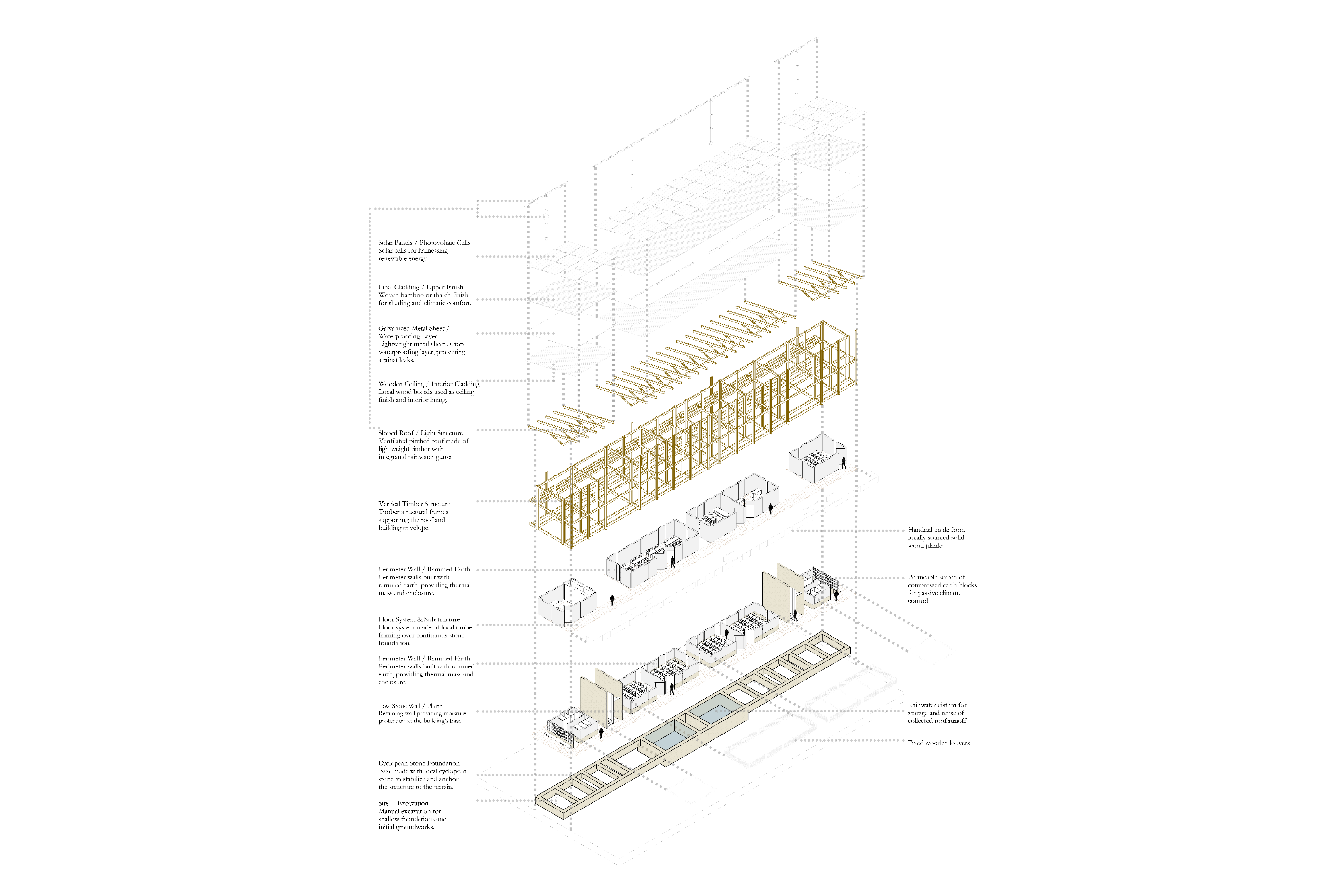 El edificio está elevado sobre una plataforma, lo que minimiza el riesgo de inundación y protege contra la intrusión de animales silvestres. La ventilación cruzada se logra mediante celosías operables y conductos verticales que canalizan el flujo de aire desde patios sombreados hacia arriba, siguiendo principios de enfriamiento pasivo. El techo inclinado, hecho con láminas galvanizadas locales, facilita la recolección de agua de lluvia y sostiene paneles fotovoltaicos para la autosuficiencia energética.