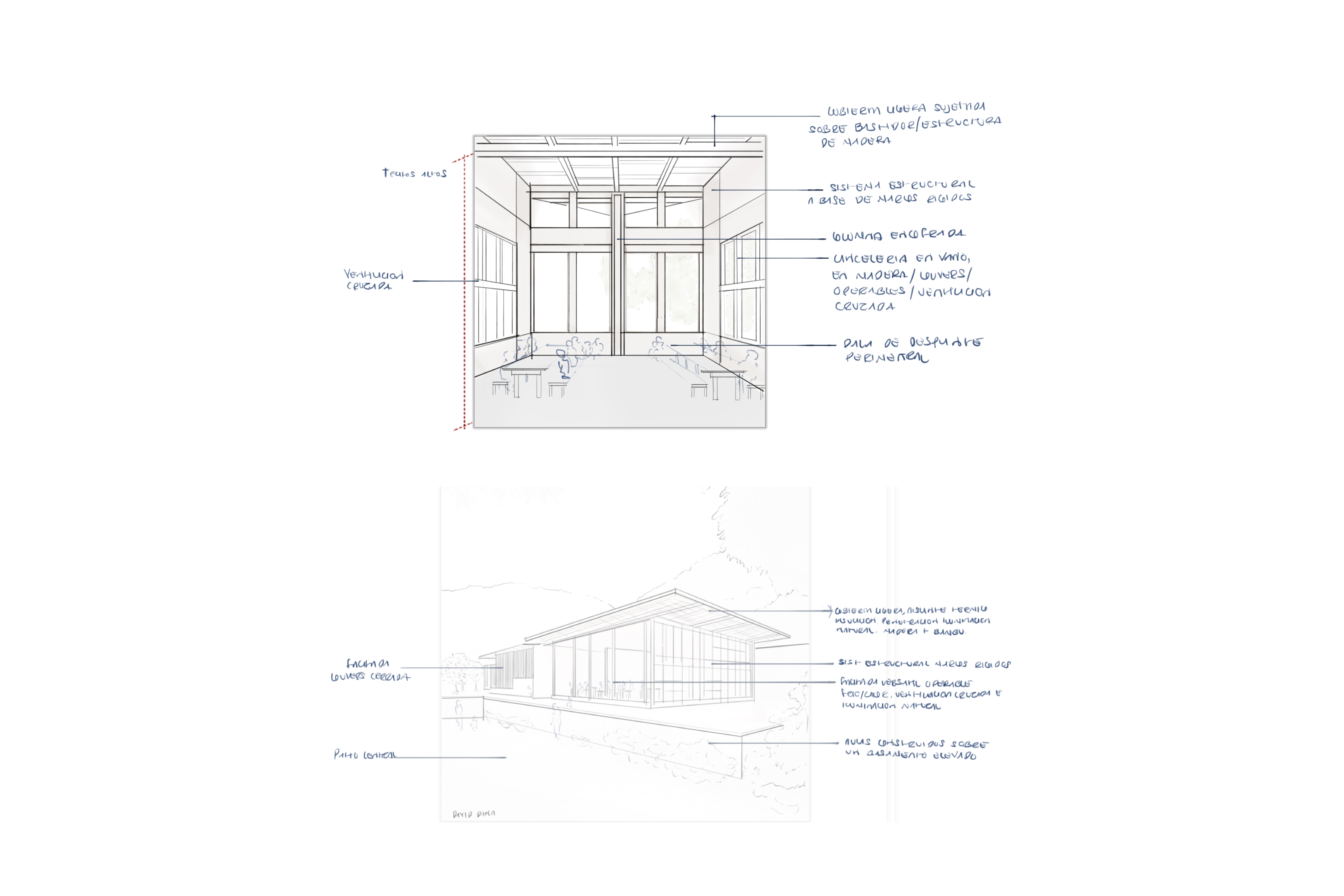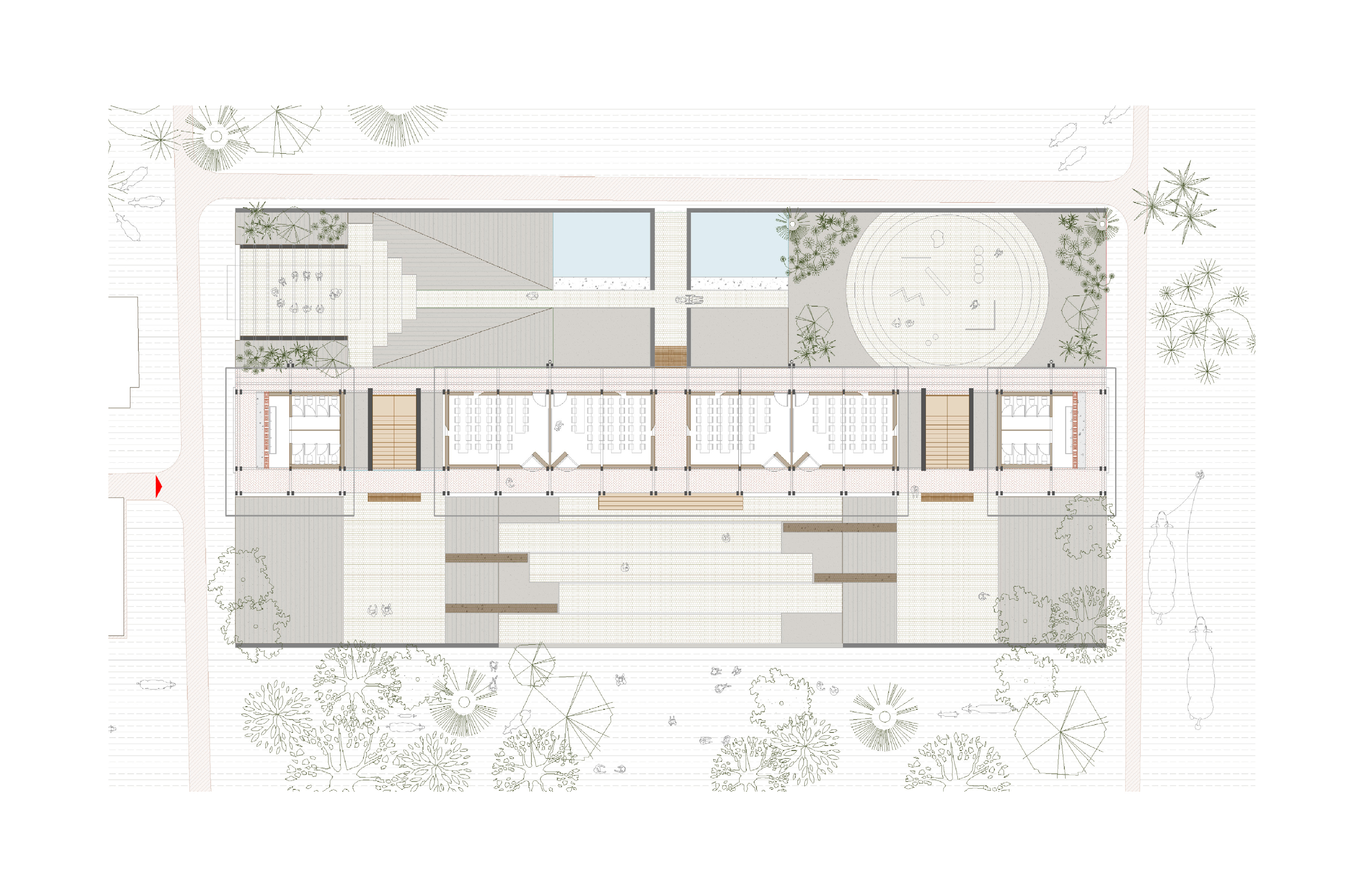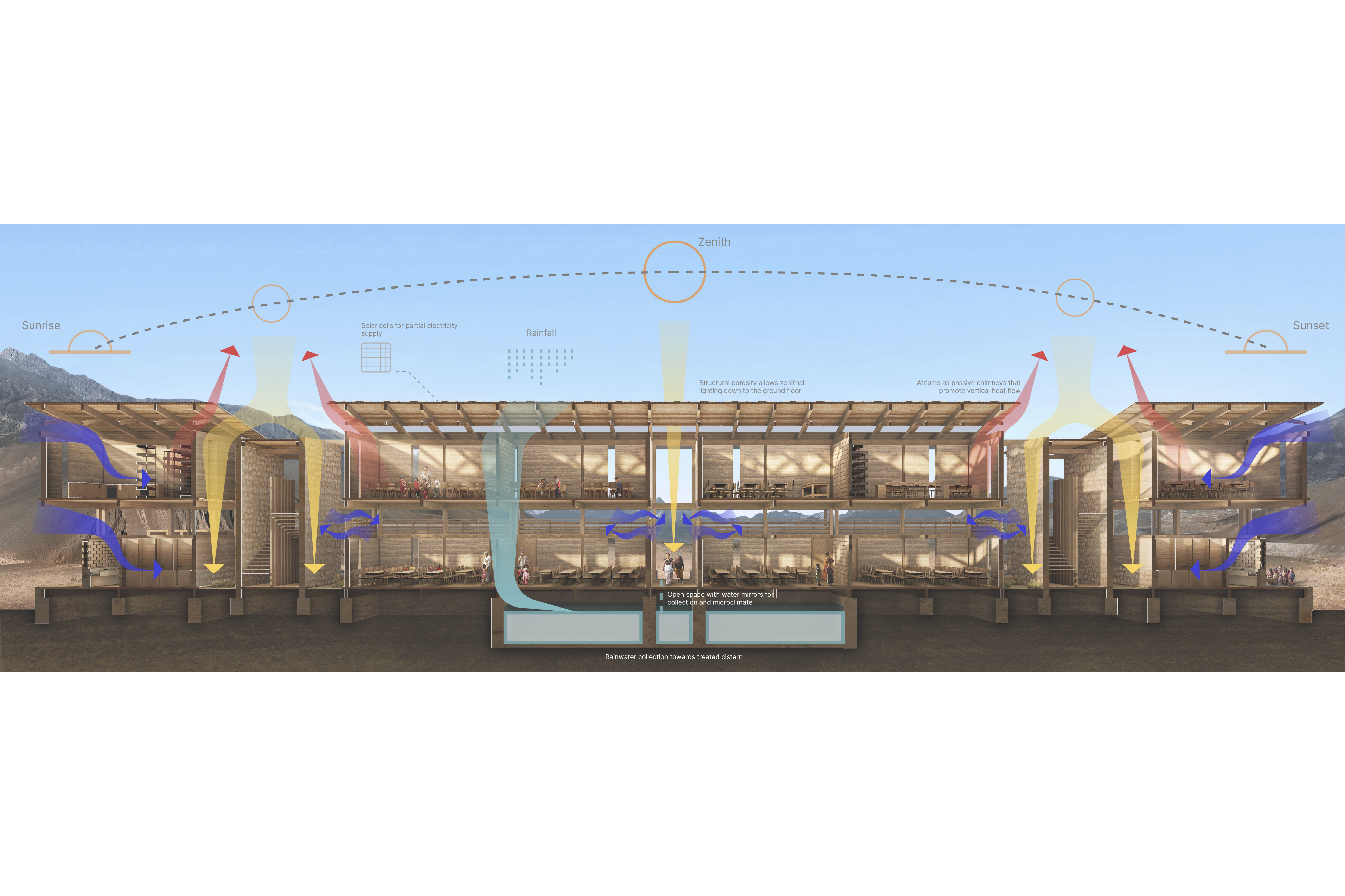 El diseño se articula en torno a una espina central: un atrio lleno de luz que funciona tanto como chimenea térmica como corazón social. Alrededor de este núcleo, las aulas y los espacios comunitarios se despliegan en módulos que pueden expandirse con el tiempo. La porosidad espacial del diseño fomenta la ventilación natural y asegura que la luz del día alcance incluso las zonas más profundas, reduciendo la dependencia de sistemas artificiales.